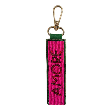 A pop of colour and fun - shop the Amore Beaded Keychain featuring vibrant hand-beaded detail in pink and green. This double-sided accessory makes a chic statement wherever you clip it.