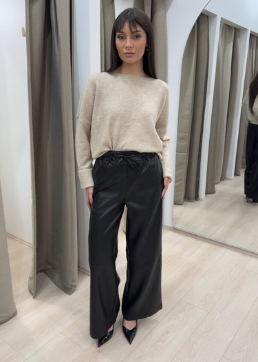 The Madison Faux Leather Pants - crafted from a soft, faux leather, they feature a relaxed wide-leg silhouette, an elasticated drawstring waistband for all-day comfort and functional side pockets. Dress them up with a blazer and heels or keep it casual with a tee and sneakers.
