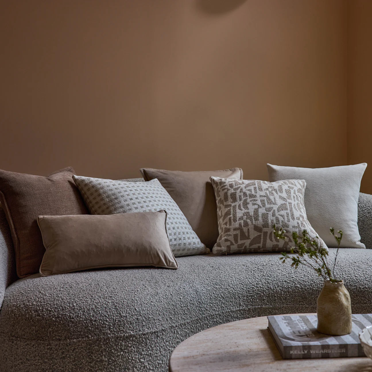 Double-sided tonal geometric jacquard design, finished with a knife edge. Feather filled