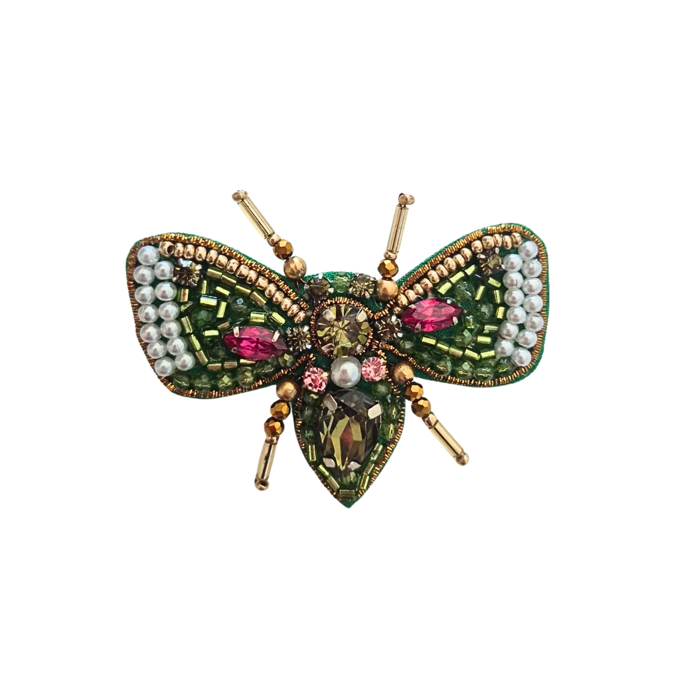 Complete your outfit with this exquisite hand-beaded butterfly brooch. Carefully embellished with intricate beadwork, this statement piece features rich emerald-green beads accented with luminous pearls, sparkling crystals, and vibrant pink gemstones. Perfect for elevating jackets, scarves, dresses, or handbags.