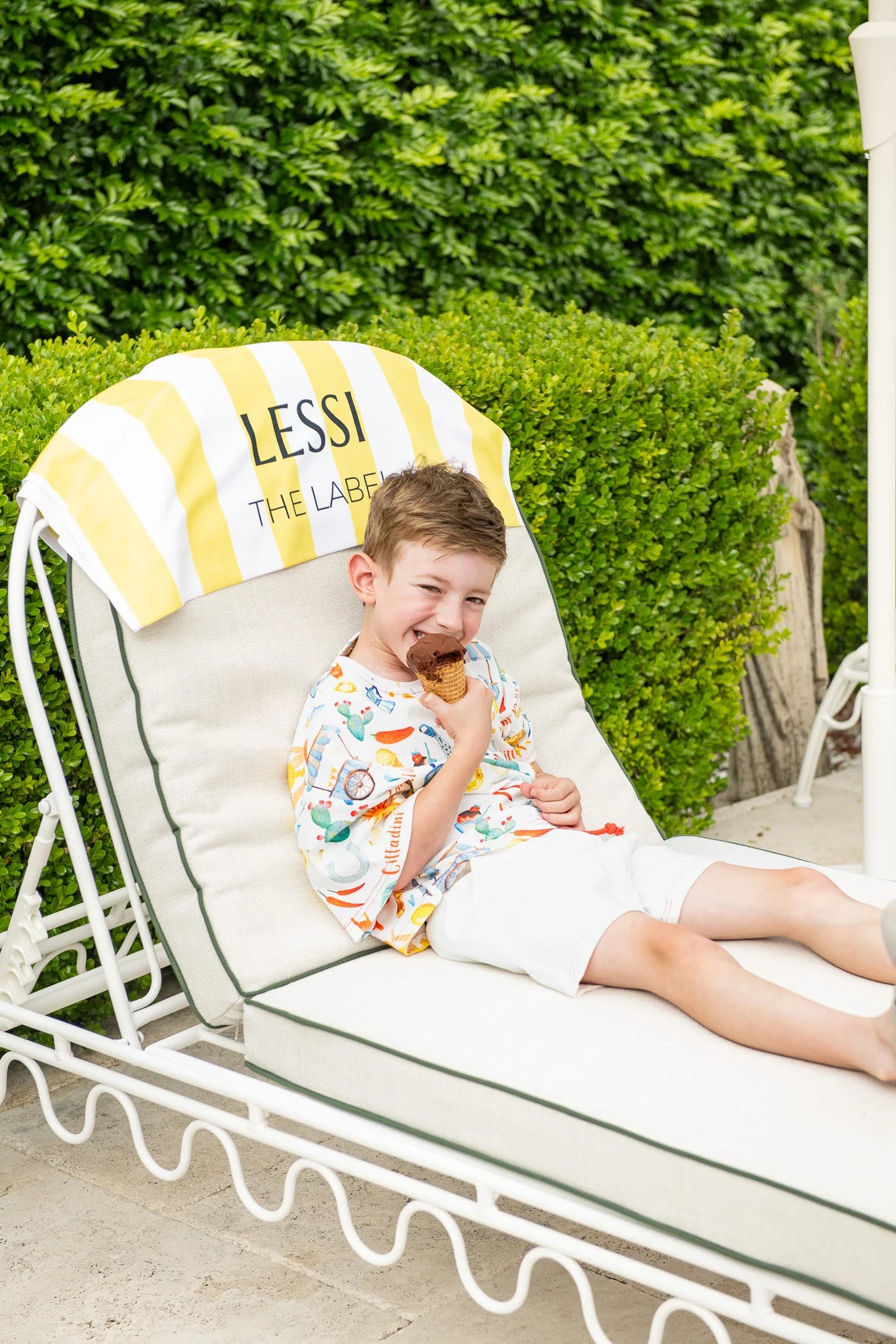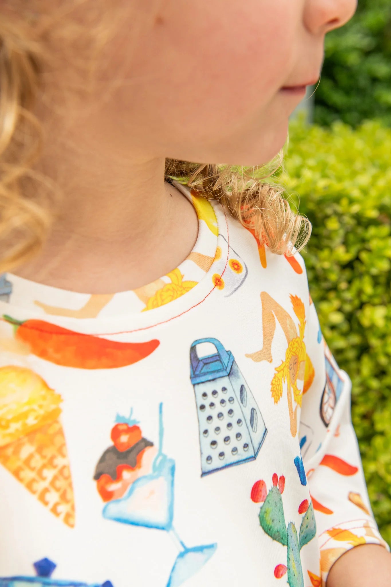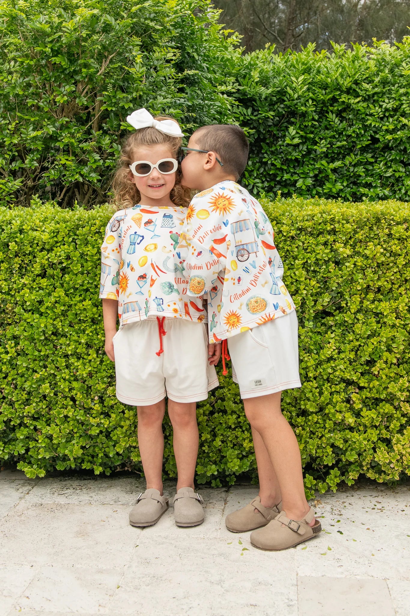 Back by popular demand, our unisex Amoe Mio Set is back in our exclusive Sicilian print. A nod to Sicily’s timeless charm, our Vacanza set pairs a vibrant printed tee with crisp white drawstring shorts. Designed for little dreamers who play under citrus trees and coastal skies.