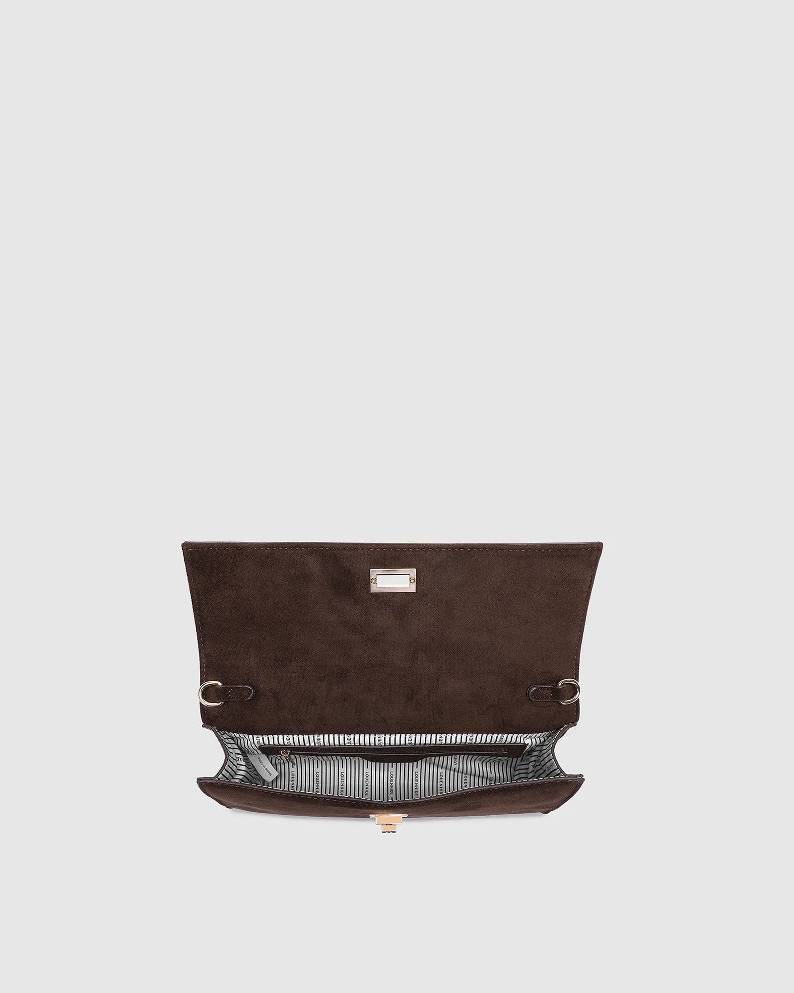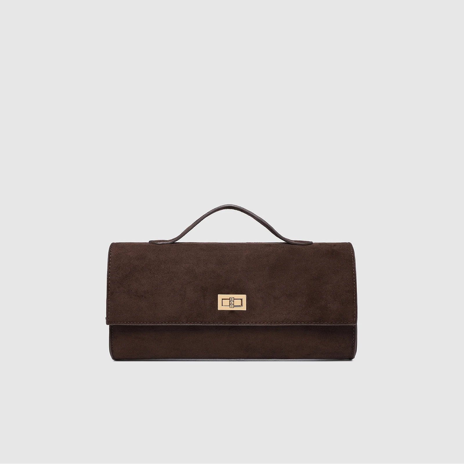 Poised and polished, the Delaney Chocolate Suedette Clutch is both statement and staple. Crafted from rich chocolate faux suede and finished with light gold hardware, she embodies effortless sophistication, equally at a café on a marble café table or tucked underarm on an evening promenade. Designed as a refined flap envelope clutch, her structured silhouette offers an elevated touch, while her form also works beautifully as a top handle bag with a fixed handle and optional crossbody strap for styling versatility. A classic turn-lock closure opens to a thoughtfully organised interior with a considered zip pocket; an understated detail designed with intention. Sleek yet softly bold, Delaney Chocolate Suedette is made for the woman who knows that true style speaks softly, a whisper of Parisian ease, carried beautifully à la française.