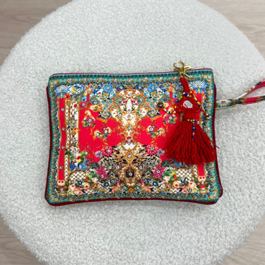 A pop of colour and fun - shop our beaded pouches featuring vibrant prints with hand-beaded embellishments. The compact yet spacious design is perfect for carrying your essentials, whether you use it as a clutch, makeup bag or beach pouch!