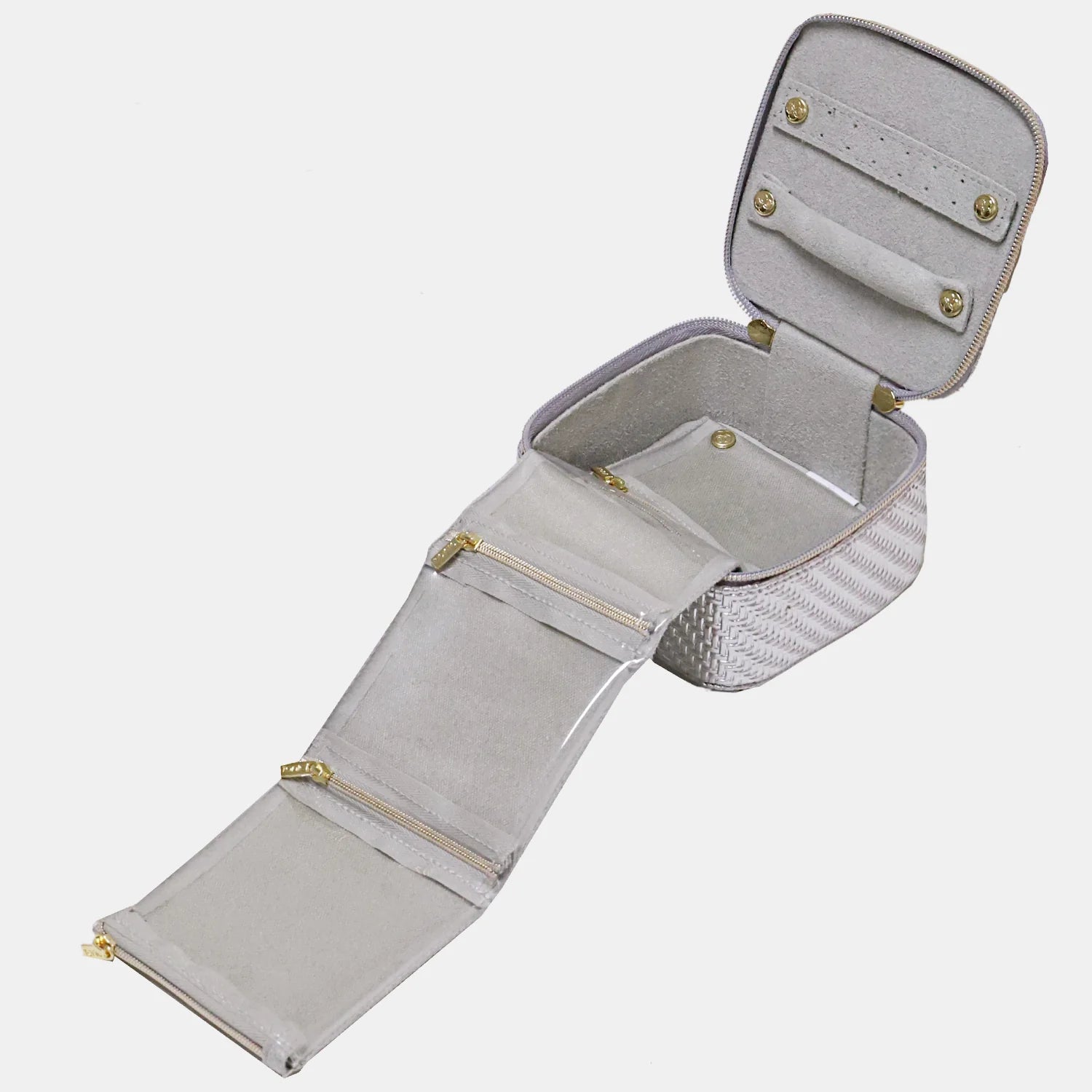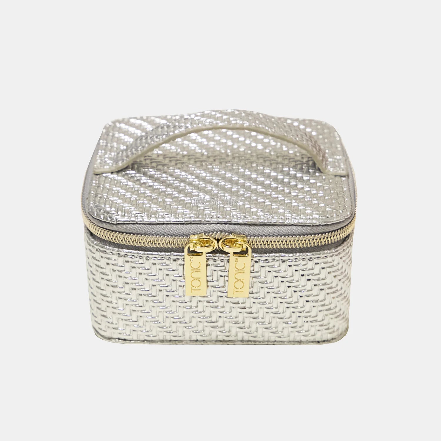 Organise in style with the Tonic Jewellery Cube in limited edition metallic silver. Crafted from beautiful herringbone textured vegan leather, the double gold zip closure opens to reveal the thoughtfully designed interior. The trademarked accordion pockets feature clear windows so you can always see your favourite items while the zip closures keep them secure and tangle free. Dedicated holders for earrings and rings make packing for travel effortless.