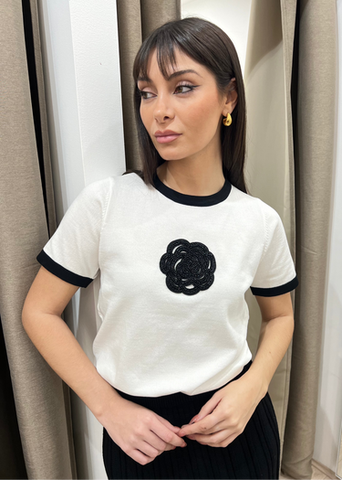 The Daisy Tee - features contrast black trimming at the neckline and sleeve cuffs and an embellished flower detailing on the front. Perfect for pairing with denim or layering under blazers.