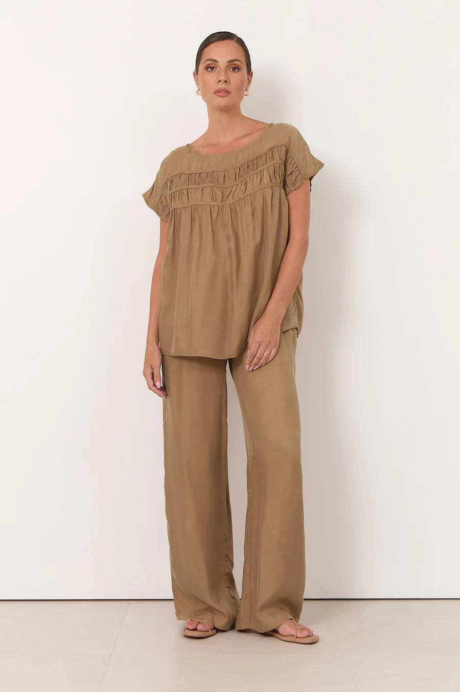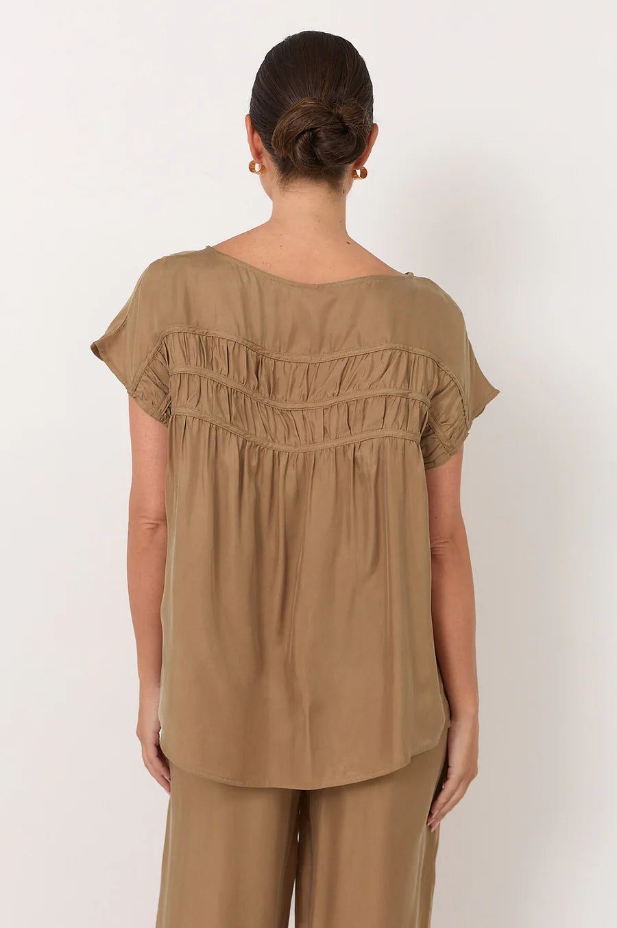 The Lira Pleated Cupro Top in Mocha is crafted from a soft cupro–viscose blend with a round neckline and short sleeves. It features a relaxed silhouette with ruching through the yoke.